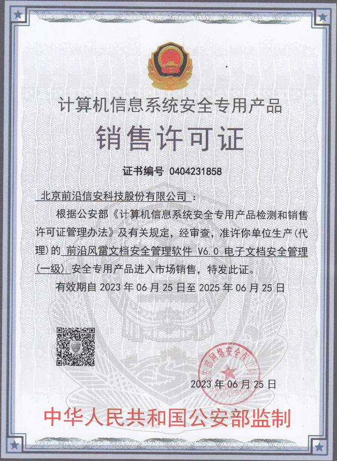 計算機信息系統安全專用產品銷售許可證--前沿數據防泄漏系統
