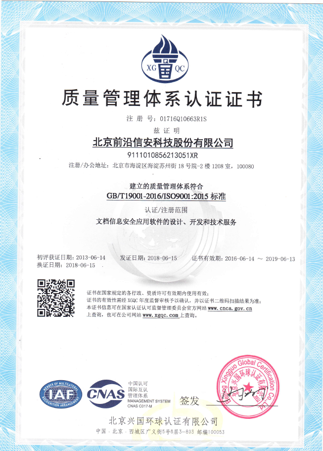 信息安全管理體系認證證書(GB/T 22080-2016/IS0/IEC 27001 : 2013)